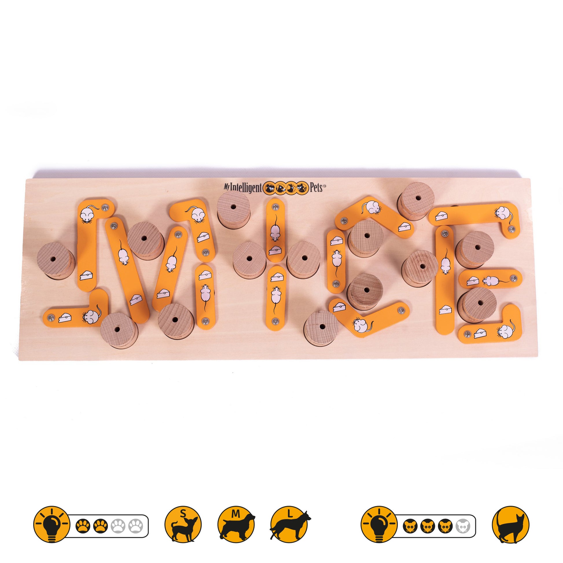 This game was designed for cats. It has a difficulty level of 3 paws. The treats are hidden under movable orange pieces that form the word MICE. In order to move the parts, wood cylinders have to be knocked over first, where additional treats are waiting for the challenger. This design features a number of obstacles that engage a cat in the game and lets it work for the prize while exercising his mental and physical skills. Did anybody say “MICE”?