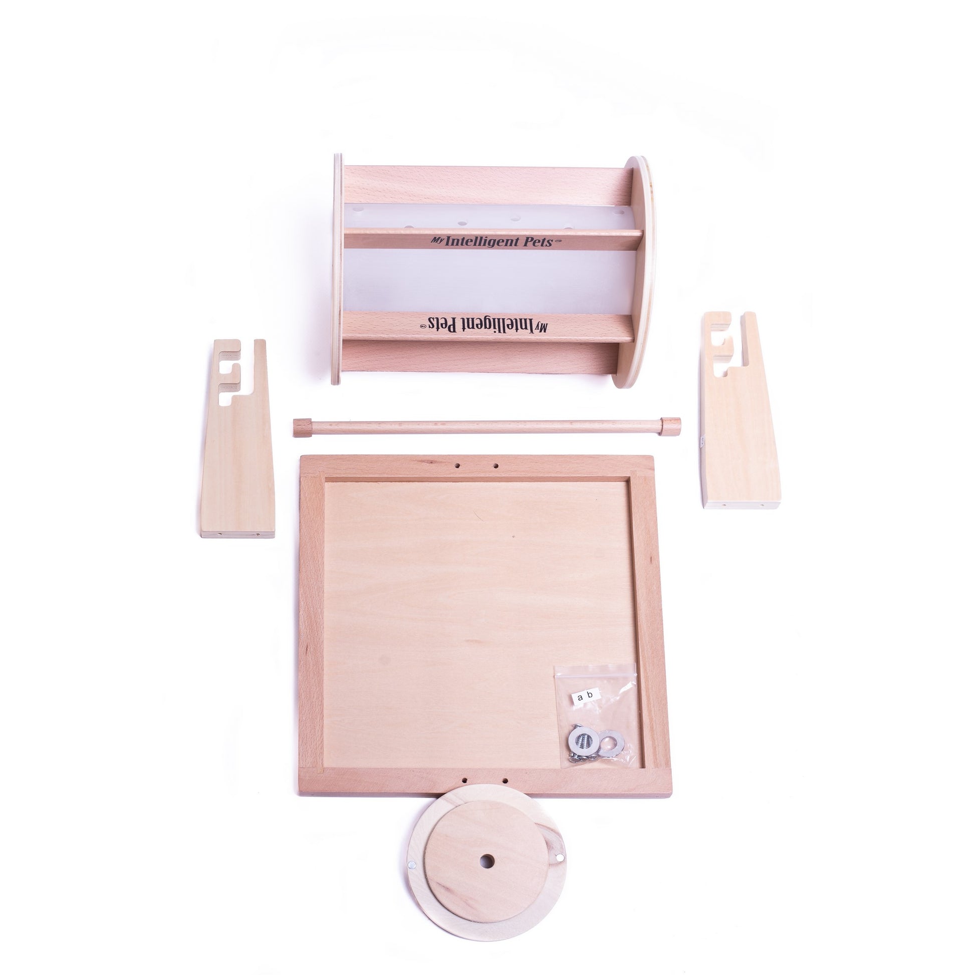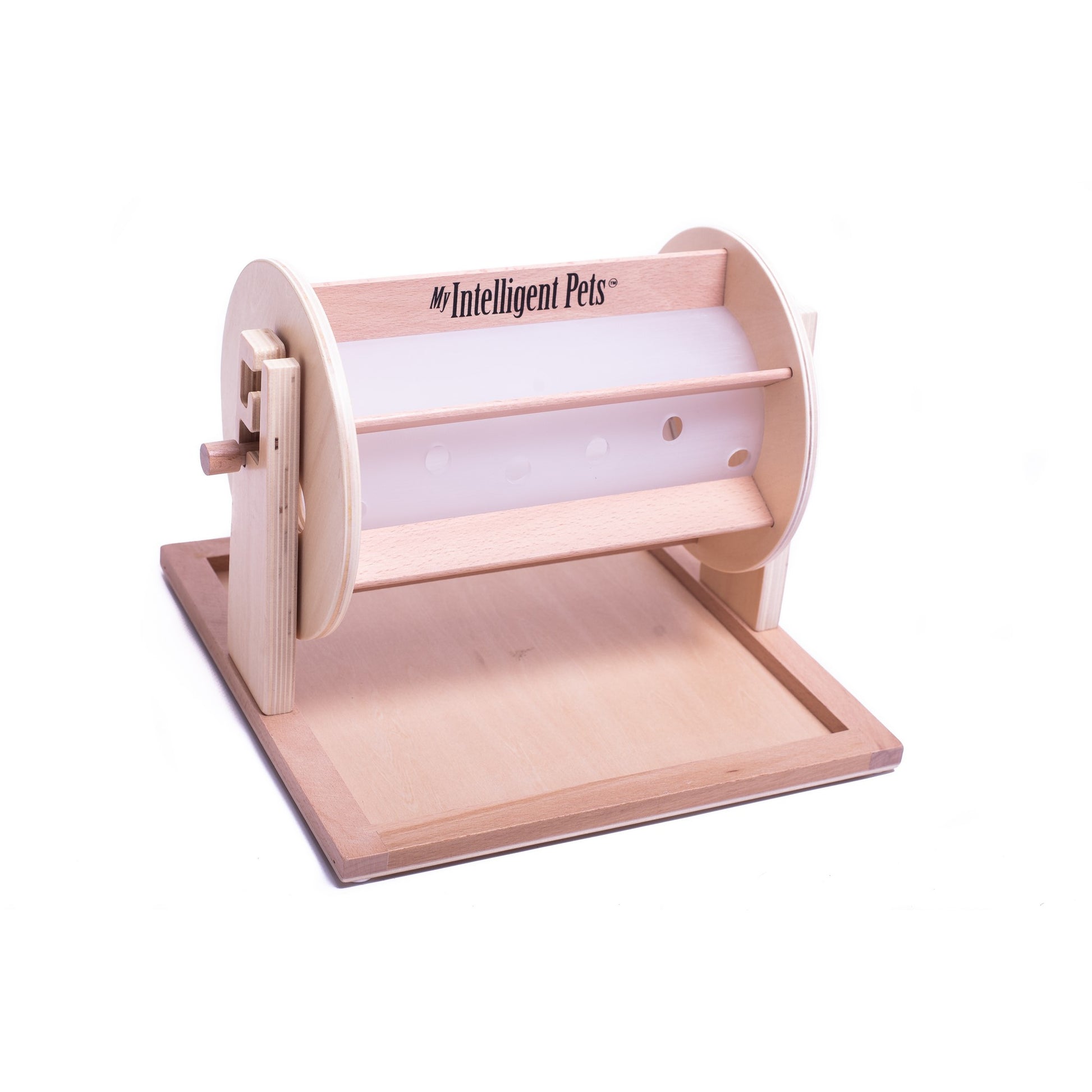 The cylinder has four segments separated by thin wooden walls, each with holes. Three segments have holes with a diameter of about 10 mm (they will not let the recommended treats fall out) and in one segment holes have a diameter of about 12 mm - they are big enough to let the treats recommended by My Intelligent Pets® get through. Once the wheel turns, treats fall out. There is an opening on the side of the cylinder which is used to refill the wheel with treats. The size of the treats should be carefully selected so that they can easily fall out through the bigger holes.